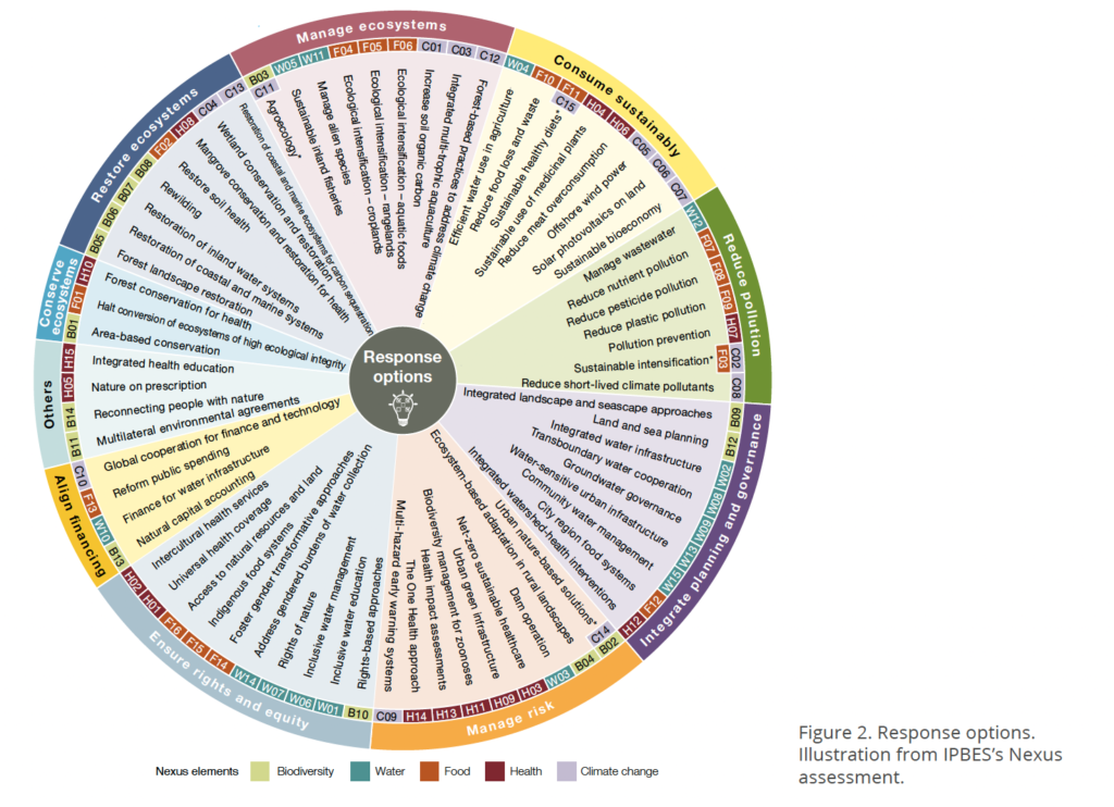 Recognition is rapidly growing regarding the scope and potential for localised, nature-based and adaptive solutions to emerging challenges. The Nexus Assessment addressed this and the complex and context-dependent feedbacks between five elements: two nature components, biodiversity and climate, and three economic sectors, food, water and health. The assessment synthesised over 70 solutions that demonstrate the potential to enhance co-benefits across sectors and reduce tradeoffs (Figure 2), while recognising nuanced customisation of individual contexts, and with success-es aggregating from local to larger scales. The assessment emphasised that a critical enabling factor of governance is that it is inclusive, holistic, equitable, cooperative and adaptive.